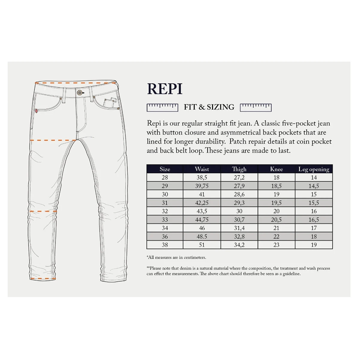 Das Repi Modell ist das Regular Slim Fit Jeans. Eine klassische Five-Pocket-Jeans mit Knopfverschluss und asymmetrischen Gesäßtaschen, die für längere Haltbarkeit gefüttert sind. Diese Jeans sind für die Ewigkeit gemacht. Ausgestattet mit Reparaturdetails an der Münztasche und der hinteren Gürtelschlaufe, Taschenaufdruck, Markenknöpfen, verdeckten Nieten und der subtil platzierten Niete der Blue de Gênes-Flagge an der rechten Vordertasche.