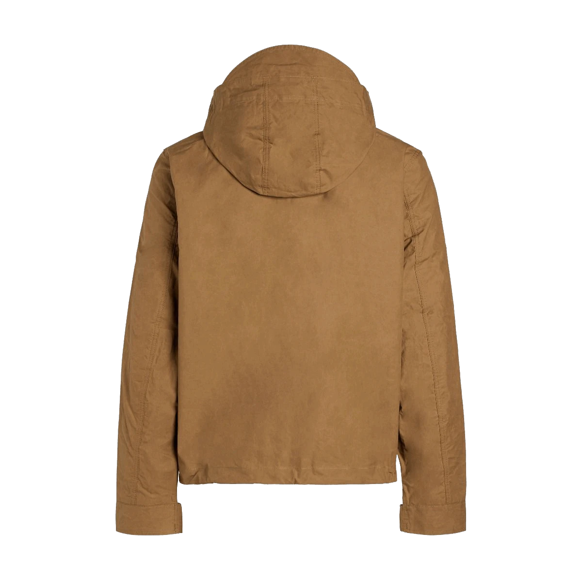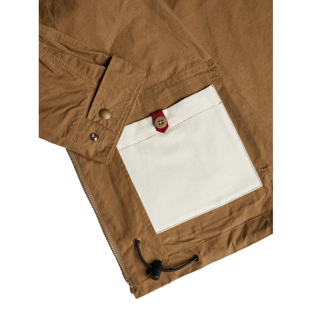 Leichte Outdoortaugliche Jacke ohne Futter. Idealer Windbreaker, der mit einer wasserabweisenden trockenen gewachsten Baumwolle auch einen Schauer abhält. Es hat runde Ärmel mit einem Riegel zum Einstellen der Weite an den Handgelenken. Er hat einen internen Kordelzug am unteren Ende mit zwei Kordelanschlägen, die die Einstellung der Weite des Kleidungsstücks am Becken ermöglichen. Ein Doppelschieber-Reißverschluss auf der Vorderseite, eine große Kapuze mit einem Kordelzug zum Verstellen und einem Kordelstopper aus Naturleder. Sie ist ungefüttert, hat saubere Nähte und zwei Innentaschen, von denen eine eine Sicherheitstasche mit Reißverschluss ist.