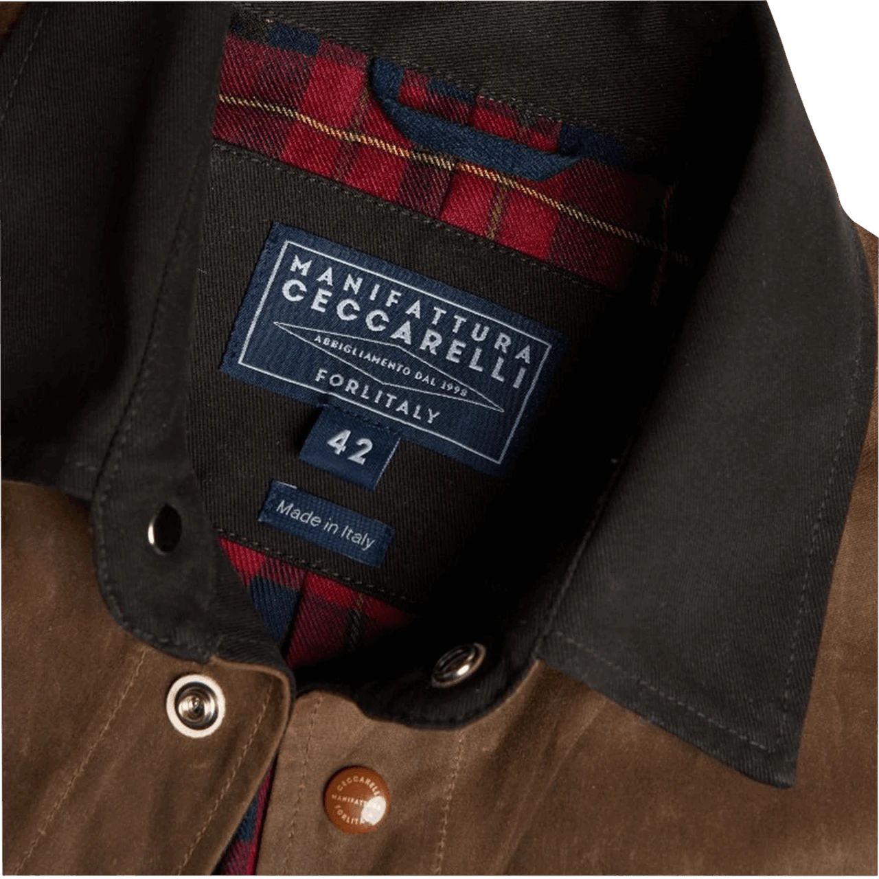 Manifattura Ceccarelli verarbeitet seit vielen Jahren eine bewährte10oz Popelin Qualität aus reiner 100% Baumwolle. Das hochgetwistete Garn ist äußerst verschleißfest und und wird durch das wachsen noch strapazierfähiger, sowie auf natürliche Weise wasserabweisend. Der Wachs wird bei dem Gewebe nicht einfach aufgetragen, sondern das Tuch wird durch ein Tauchbad aus geschmolzenen Paraffin gezogen, so dass der Wachs in die Faser dauerhaft eindringt und versiegelt.