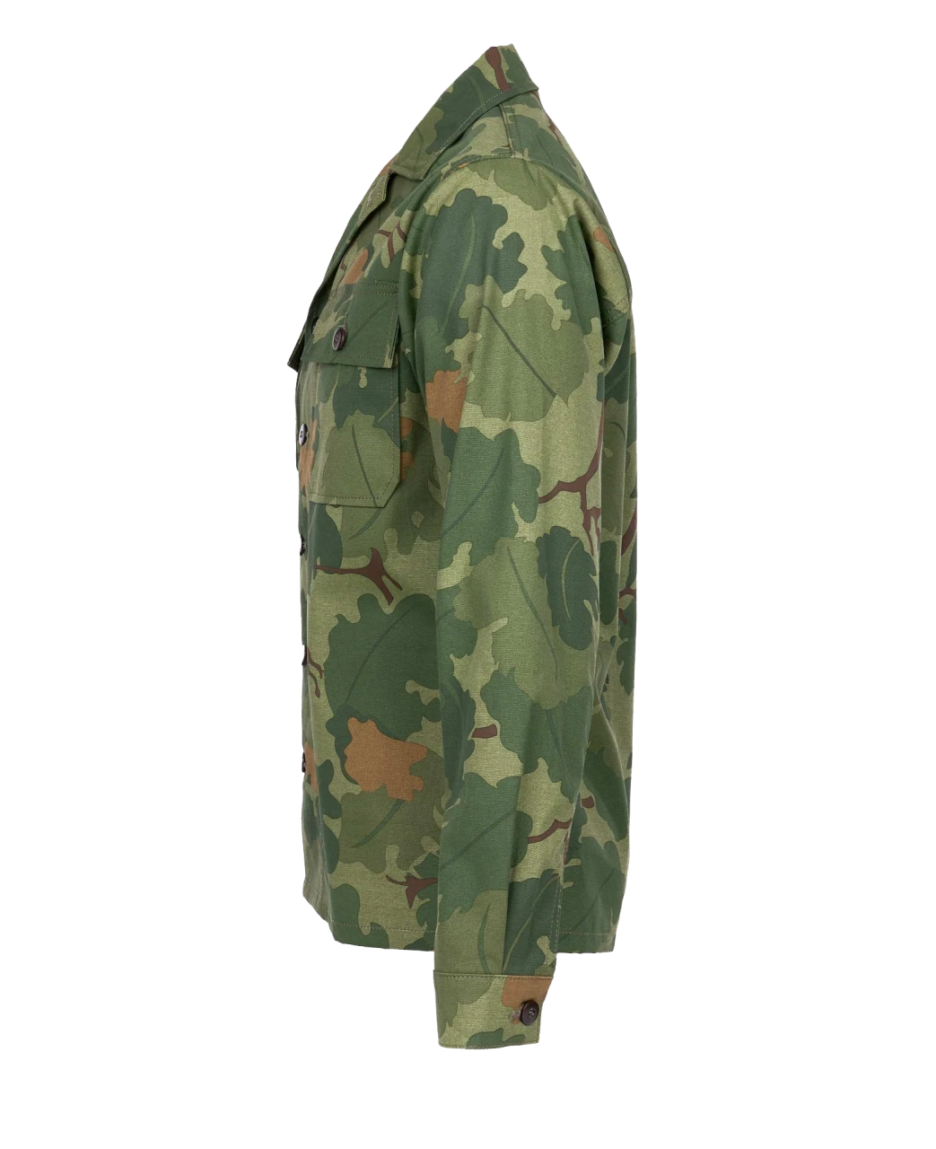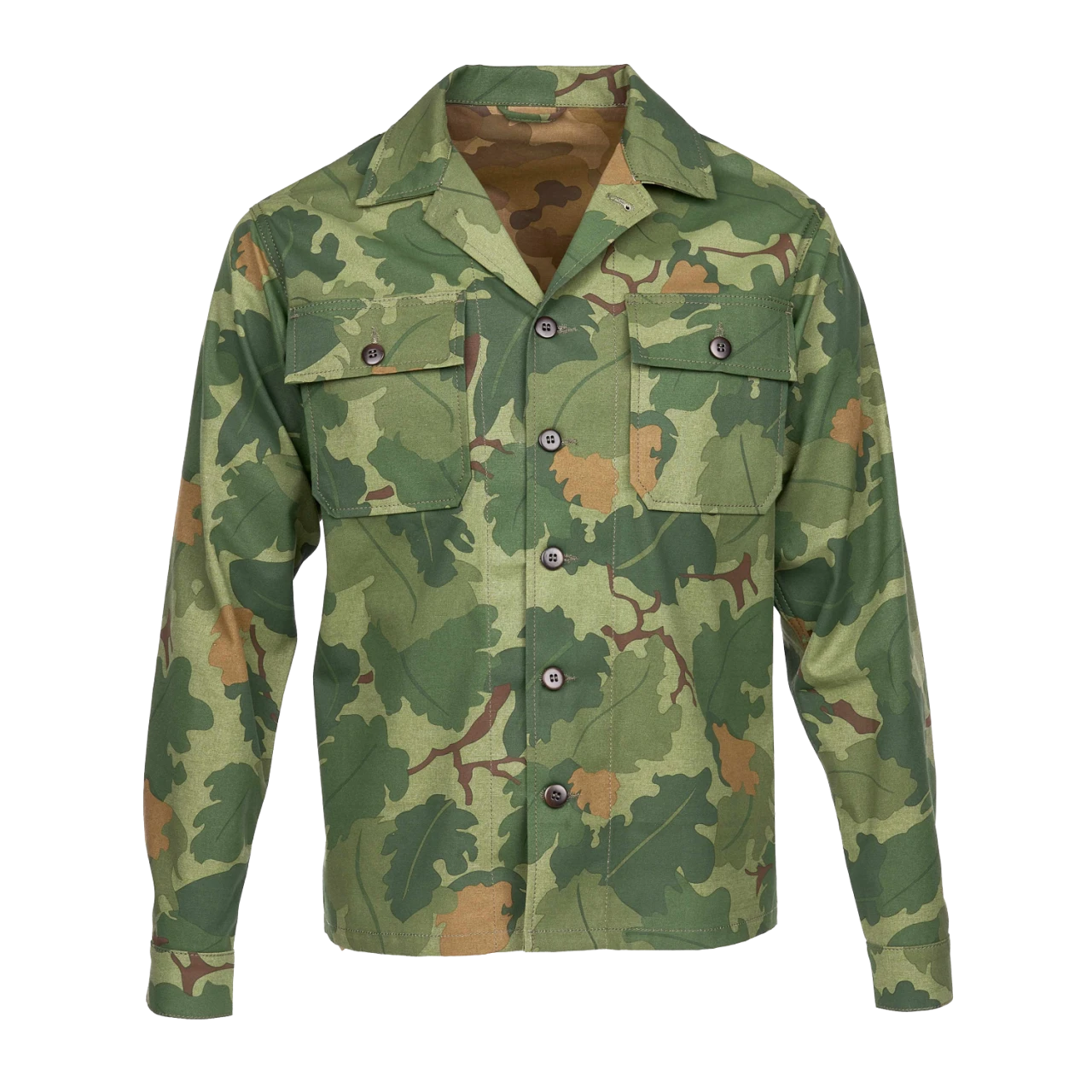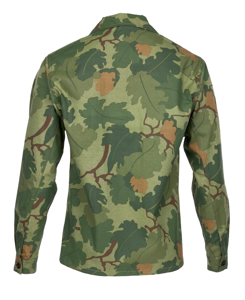 Für Sommer 2023 hat Pike Brothers das Hemd aus einem speziellen Camoflage Muster, genannt Mitchell Pattern, gefertigt. Dieses Muster wurde ab 1953 an das United States Marine Corps in Form von Zelten und Helmbezügen ausgegeben. Die Verwendung war im Laufe der Zeit aber nicht auf das USMC beschränkt. Das Mitchell, welches auch Leaf Pattern genannt wurde, ist ebenso gerne von U.S. Spezialeinheiten wie den Special Forces verwendet worden. Da der originale Print und Stoff ein wendbarer schwerer Canvas Stoff für Zelte war, und für Uniformen zu schwer und unbequem war, wurden für Uniformen von privaten Herstellen Kleinserien gedruckt. Die waren nicht wendbar und leichter. Die nicht standardisierten Teile konnten dann privat beschafft werden. So zum Beispiel von kleinen Schneiderein in Okinawa, Japan. Für das Mitchell Print hat Pike sich genau an ein solches privat beschafftes Set aus japanischer Produktion aus den 1960ern orientiert.