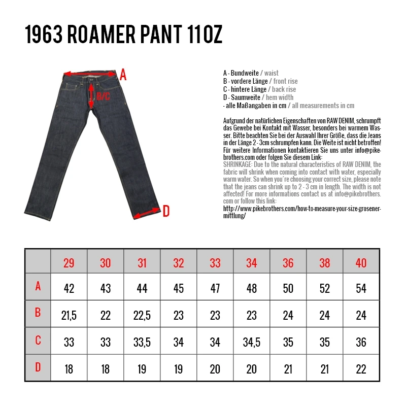 Hinweis: Zu berücksichtigen ist, dass die Ware einen natürlichen Einsprung bei der ersten Wäsche hat. Das bedeutet, dass die Hose bei den ersten Wäschen nur in der Länge ca. 2-3 cm einläuft. Bitte achten Sie daher beim Kauf auf die richtige Länge. Da die Hosen aus ungewaschenen Raw Denim gefertigt wird färbt die Ware auf hellen Oberflächen ab. Bitte wir unbedingt die mitgelieferte Waschanleitung beachten.