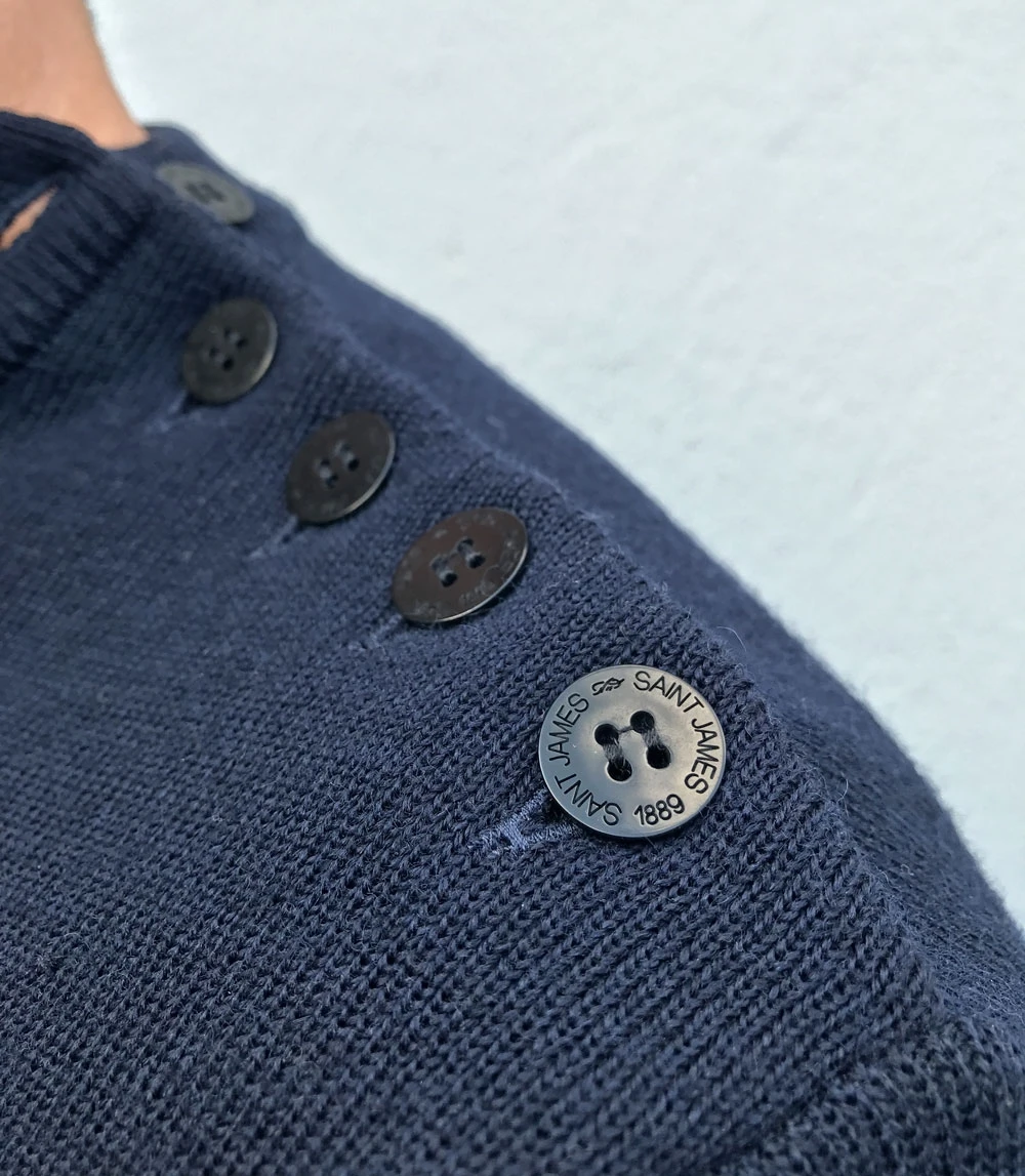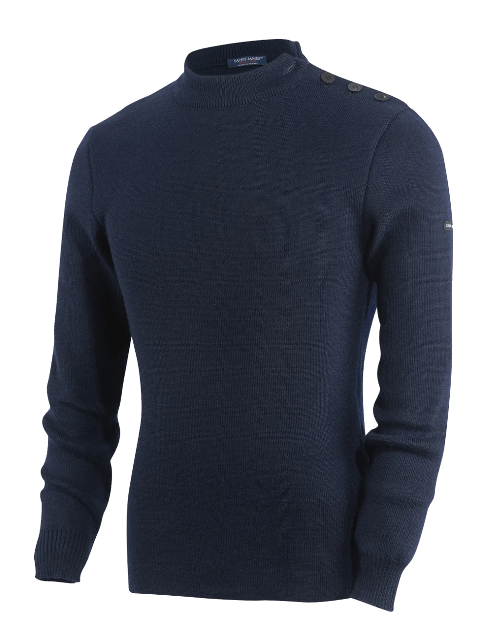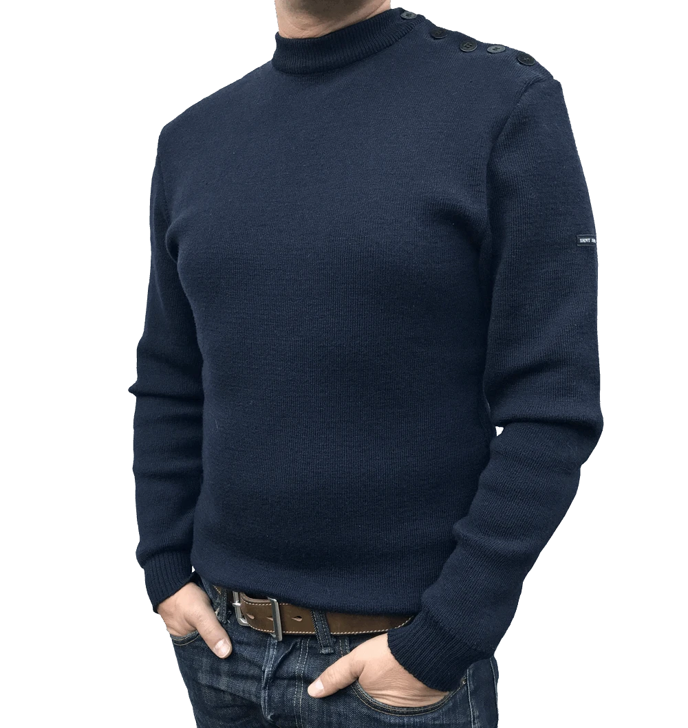 Auch hier trennt sich schnell die Spreu vom Weizen, wenn man dieses Original mit anderen Modellen vergleicht, denn der originalgetreue Pullover ist so dicht gewebt, dass ihm weder Wind noch Salzwasser etwas anhaben kann. Er liegt eng am Körper an und ist lang genug, dass er nicht hochrutschen kann. Dabei ist die hochgezwirnte Wolle ist so elastisch, dass er wie eine zweite Haut sitzt. Qualität hat hier im Übrigen auch ihr Gewicht, denn für die Herstellung eines Matelot-Pullovers werden nicht weniger als 23 Meter Wolle benötigt. Das bedeutet, dass aus dem Vlies eines Schafes 3 Matelot-Pullover hergestellt werden können. Der fertige Pullover wiegt 2 Pfund und hat vom Stricken bis zum Verpacken 18 Arbeitsschritte durchlaufen. Die Wolle wird zunächst auf den Webstühlen in Bahnen gestrickt, deren Konfiguration und Überwachung von den Strickmeistern übernommen wird. Nach dem Stricken werden die Bahnen gedämpft, um sie zu stabilisieren. Eine Ausnahme bildet der authentische Matelot-Pullover, dessen Materialstabilisierung durch das 72-stündige Abflachen der Bahnen auf Gestellen erfolgt.