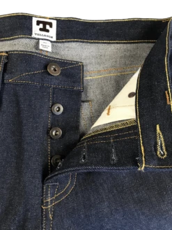 Der Straight Tapered Schnitt der Sheffield ist die Kombination aus einem geraden Bein bis zum Knie und von dort an ein nach unten zulaufendes Bein. Wer also eine entspannte Passform mag, kräftige Beine hat, aber gerne auf die oft daraus resultierende große Fussweite verzichten will, der ist mit der Sheffield bestens bedient. Das Modell wird wie bei Tellason üblich mit einer 34, bzw. 36 Länge geliefert und läuft durch die Sanforisierung auch nur noch unwesentlich in der Länge ein. Knopfleiste, gefütterte Gesäßtaschen, Lederpatch von Tanner Goods aus Portland